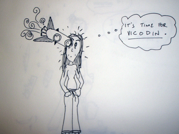 [Image description: A line drawing of a young woman with a quizzical facial expression who has a rocket embedded in the left side of her head. A thought bubble to her right reads, “It’s time for Vicodin.”]
