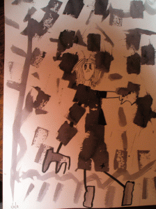 [Description: Black and white painting of a bunch of random splotches, in the midst of which is a woman who stands uncomfortably while holding her right arm out to the side. Her arms and hands are composed of large, random shapes, her legs are thick black lines, and her feet are rectangles. She stares directly at the viewer, and does not appear to have a mouth.]