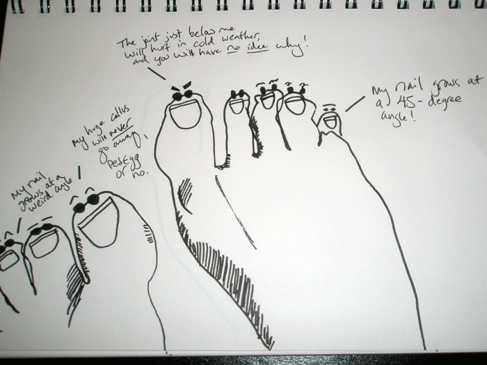[Description: Black and white line drawing of two feet; all of the toes have gleeful facial expressions, and a few of them have dialogue lines. Third left toe: “My nail grows at a weird angle”; Big left toe: “My large calluses will never go away, Ped Egg or no”; Big right toe: “The joint just below me will hurt in cold weather, and you will have no idea why!”; Smallest left toe: “My nail grows at a 45-degree angle!”]