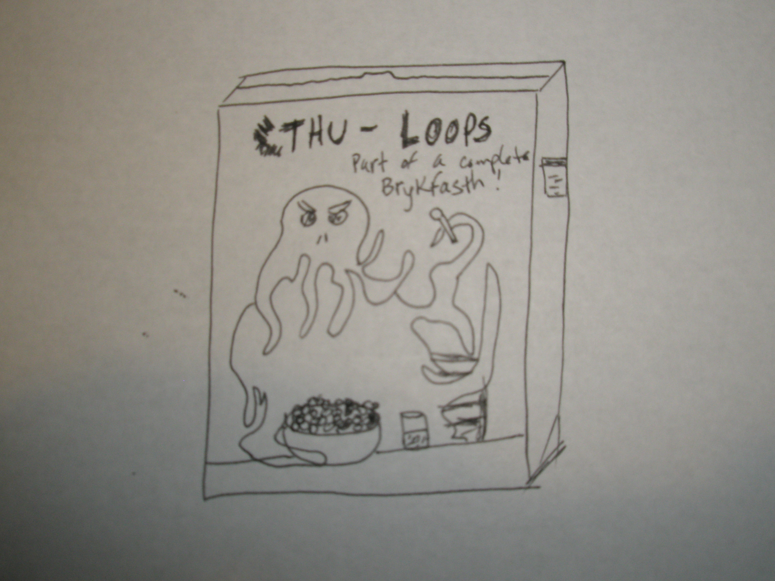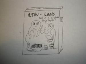 Description: A cereal box picturing an alien-like creature eating from a bowl; the text reads “Cthu-Loops: Part of a Complete Brykfasth!”